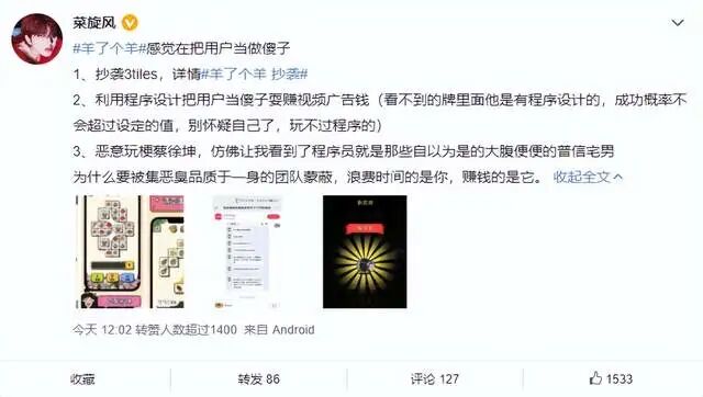 比如就有铁粉在微博上公开怒批《羊了个羊》恶意玩梗,吃相难看,还说这款游戏的程序员是自以为是的“普信宅男”,希望大家能够抵制这款游戏。