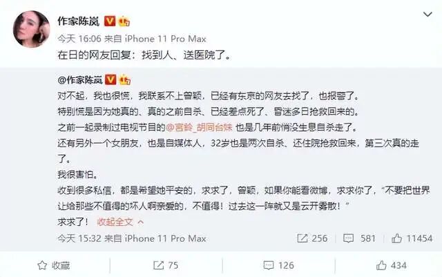 而就在不久前,有网友就已经在微博上发出求救信息,跟陈岚一样表示已经联系不到曾颖,希望日本的朋友能够帮帮忙,尽快找到她,因为曾颖在朋友圈写下了遗书,表示将会离开这个世界。