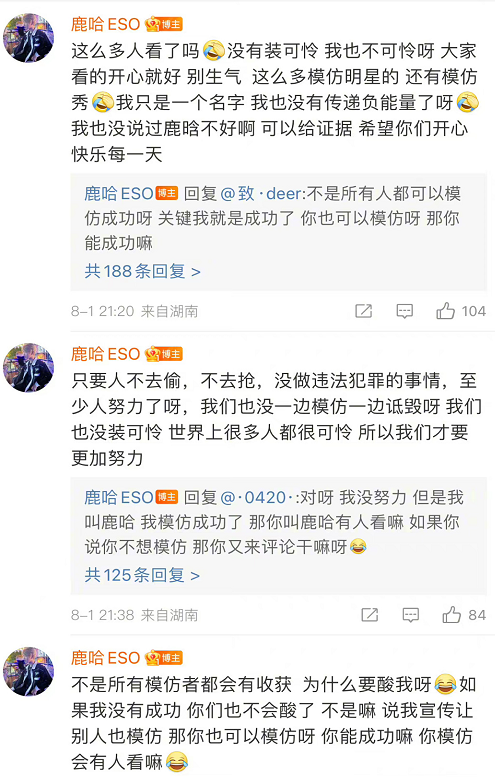 话虽如此,但是这种想法也算是受害者有罪论,不能因为鹿哈喜欢鹿晗就可以胡作非为,打着模仿的幌子仅做一些侵权的事,这也是说不过去的事。
