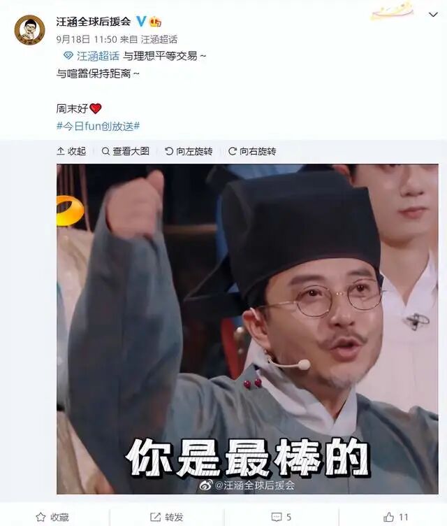 除此之外,汪涵全球后援会也在第一时间通过微博声援汪涵,发文称“与理想平等交易,与喧嚣保持距离”。虽然没有明确将这件事给指出来,但大家其实都心知肚明。