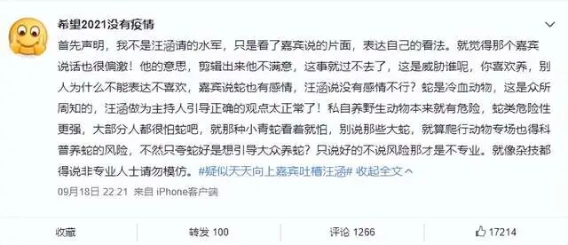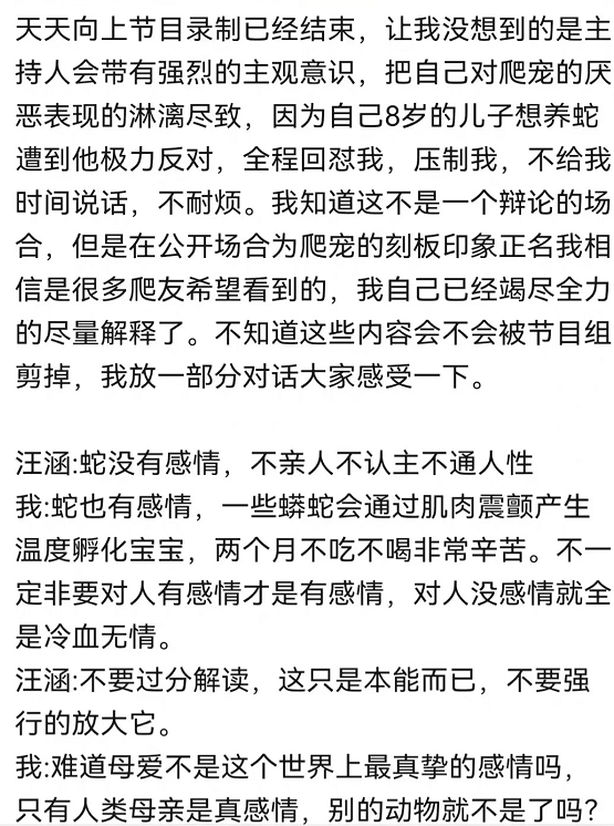 总而言之,养蛇没有对与错之分,只在于可行与不可行的问题,就算汪涵在录制节目过程中,带有个人情绪化,嘉宾也不该在网上说三道四,这样做确实有些太过于狭隘了。