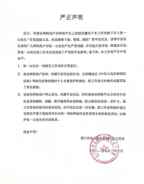 而从张一山这边的声明内容来看,并没有赘述太多,而是直面去回应,重点提到了三个方面,一个是作品即将下架,还有一个是吸毒,另外一个就是嫖娼,称以上全都是不实信息。