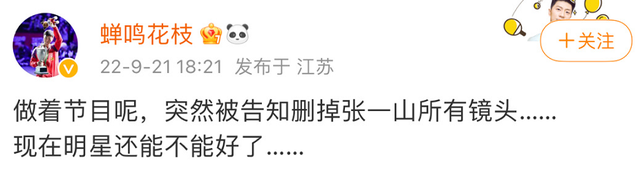 比如一位名叫“蝉鸣花枝”的博主,在张一山事件闹得最凶的时候,突然在微博上爆料称,说自己正做着节目,突然被上面告知要求删掉张一山的所有镜头,并且还吐槽说了一句,现在明星还能不能好了。