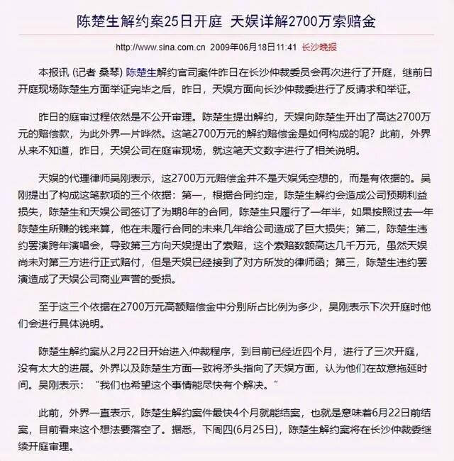 后来陈楚生执意要走,单方面向天娱提出解约,可结果等来的就是天价索赔,要求陈楚生支付2700万解约赔偿金,甚至很早之前网上还流传过227亿的违约赔偿金,但被天娱律师给辟谣。