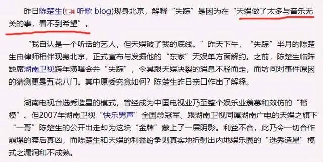 当时在新闻发布会现场,陈楚生一针见血指出道:“失踪是因为天娱做了太多与音乐无关的事,让我看不到希望。”