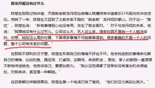 除此之外,陈楚生还表示跟天娱闹解约,其实跟龙丹妮并没有过节,因为他知道公司这么大,有这么多艺人,很多事情都不是由她一个人能够决定的,就算有问题,也是公司体系出现了问题,这个跟龙丹妮是没有关系的。