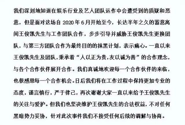 对此,王俊凯及其工作团队心知肚明,之前还特意发声回应过,表示王俊凯遭到了抹黑计划,有人想要离间王俊凯和工作团队的合作,着重强调这一拨包藏祸心之人是“黑暗势力”。