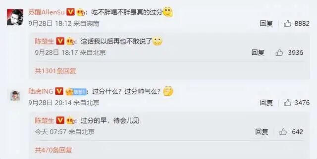 值得关注的是,陈楚生晒出健身照后,除了收到粉丝留言以外,还收到了好兄弟苏醒和陆虎的留言,准确来说是调侃。