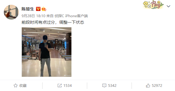 日前,知名男歌手陈楚生通过微博晒出了一张健身照,表示前段时间有点过分,想要调整一下状态,引起了很多人的关注。而一向文静不好动的陈楚生,突然去健身房锻炼身体,的确是比较罕见的。