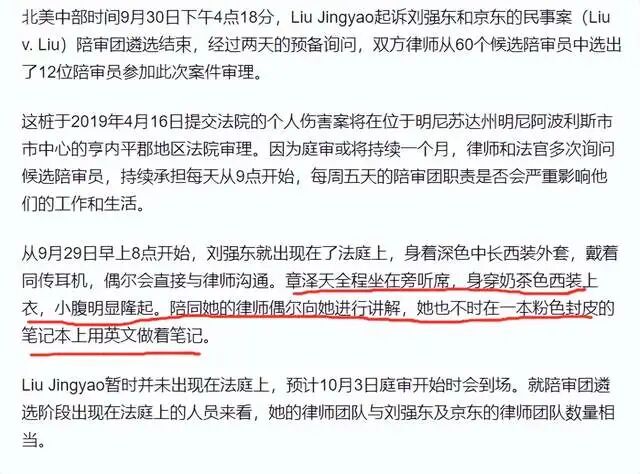 值得一提的是,陪审团选定的当日,刘强东不仅出现在了法庭,而他的妻子章泽天也出现在了法庭,全程坐在旁听席上,并且还自带了一本笔记本,边听律师讲解边用英文认真做着笔记,很多人看到后直呼她的心眼真大。