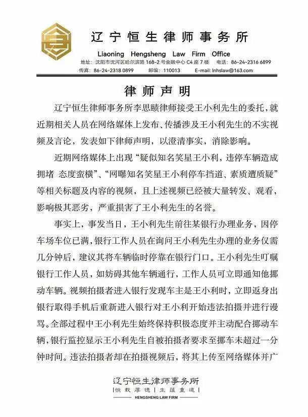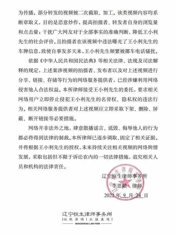 后来随着事件不断升级发酵,王小利在第一时间委托律师对外发布声明,详细讲述了整件事情的经过,同时表示将会通过法律途径追究拍摄视频男子的责任。