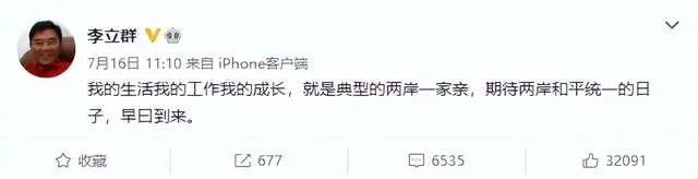 后来迫于外界巨大的舆论压力,李立群通过微博做出了回应,强调两岸一家亲,也期待和平统一,但却没有对此前接受台媒采访的内容做出合理的解释,包括死守到底的言论,确实有些模糊不清,甚至是模棱两可。