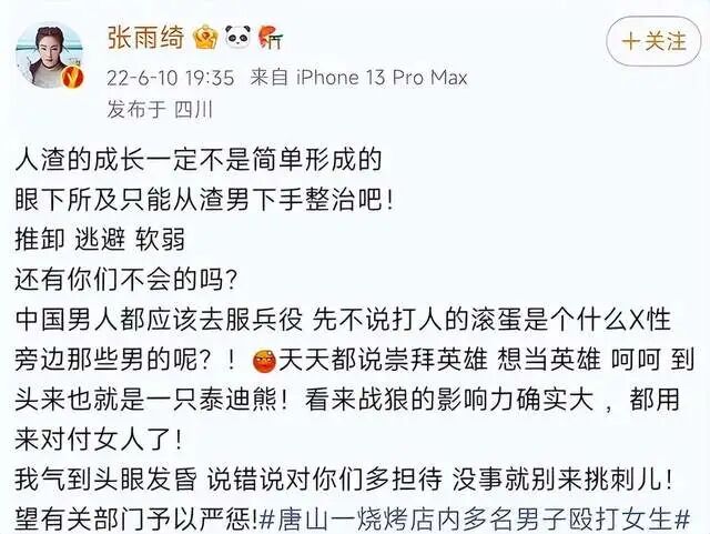然而这一切都得从今年6月份说起,那个时候张雨绮在微博上为唐山烧烤店打人事件发声,怒斥施暴者是人渣,必须要严惩不贷。