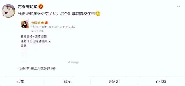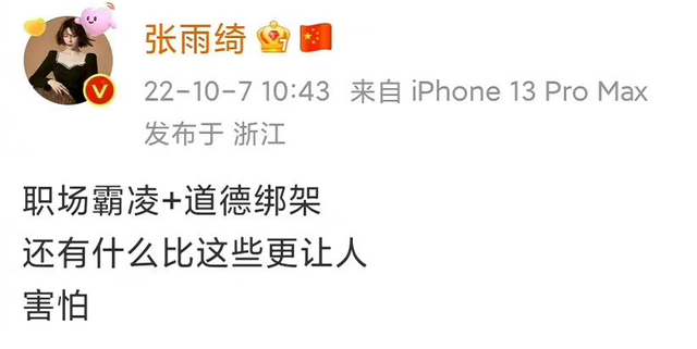 10月7日,知名女演员张雨绮突然通过微博斥责职场霸凌和道德绑架,称没有什么能够比这些事更让人感到害怕,可紧接着没过多久的时间,她便删除了这条微博,在全网引起了不小的热议。