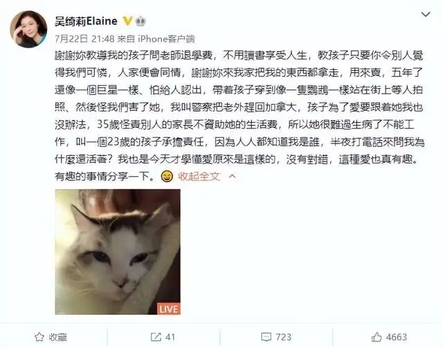 在今年7月份的时候,吴绮莉突然通过微博有感而发,聊到了女儿的一些事情,说是很多人误会了她,其实并不是她不想管吴卓林,而是吴卓林受到了Andi的蛊惑,总想着从她这里搞生活费。
