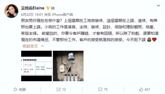 但实际上,吴绮莉的日子并不好过,此前还自曝在工地做装修,每个星期要上课,同时还兼顾着演戏、主持、设计、保险和理财顾问,大事小事都是她一个人来承担,只要能够赚到钱,再辛苦也都是值得的。