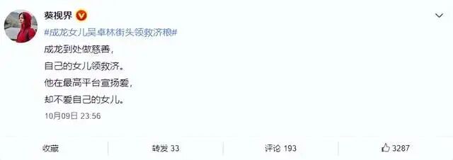 对此,有很多大V实在看不下去了,站在道德的制高点,对成龙是一顿谴责,说他到处做慈善去帮助陌生人,但自己的女儿却在国外领救济粮。还说他整天在各大平台宣扬爱,却不爱自己的女儿,相当的讽刺。