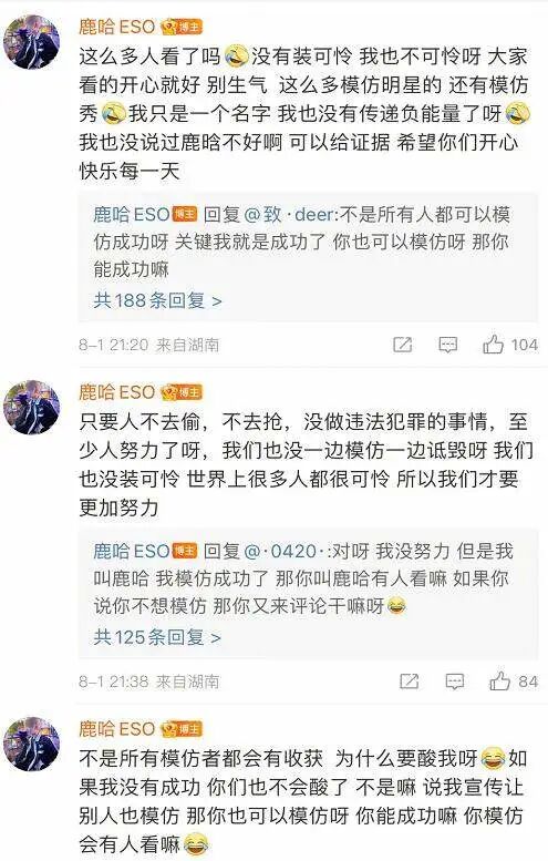 按理来讲,鹿哈应该要更加的低调,但是他并没有这样做,甚至偷换概念以模仿为荣,说自己是成功的,没有传播负能量,更没有说过鹿晗的坏话。还说如果大家觉得不服气的话,也可以去尝试模仿一下鹿晗,看能不能成功。