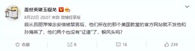 不过在今年八月份的时候,盖世英雄玉椒龙就爆料过吕丽萍受到了美国教堂的冷落,缘由就是她在微博上悼念日本前首相安倍晋三,遭到了平台的禁言,认为她没有了利用价值,也就边缘化对待。