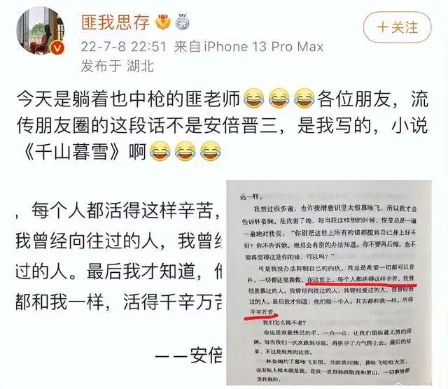 只不过尴尬的是,吕丽萍悼念安倍晋三引用的词句都搞错了,根本就不是安倍晋三生前所说的,而是知名女作家匪我思存写的。
