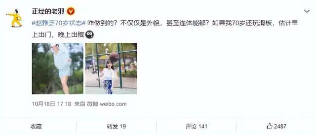 对此,大V正经的老邪通过微博以开玩笑的口吻评价了赵雅芝玩滑板一事,说要是自己70岁还玩滑板,估计早上出门,晚上就出殡了。