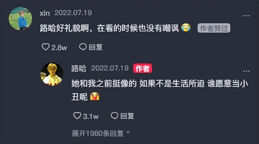 其中就有粉丝在评论区留言道:“鹿哈好礼貌啊,在看的时候也没有嘲讽。”可没想到的是,鹿哈却以一副受尽委屈的口吻回答道:“她和我之前挺像的,如果不是生活所迫,谁愿意当小丑呢?”