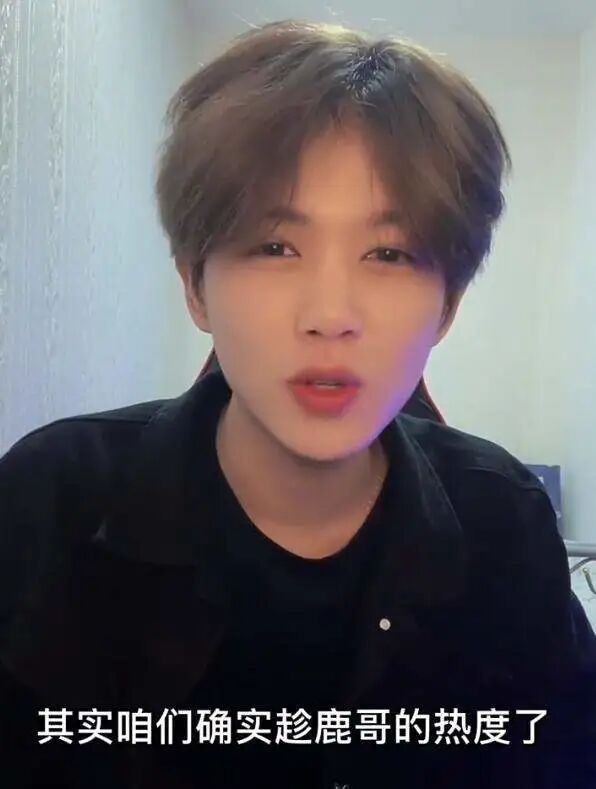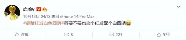 又比如前段时间鹿晗以一身红发白色西装造型出席活动,上了热搜引起巨大关注后,鹿哈表示也想跟风染个红发配个白西装。