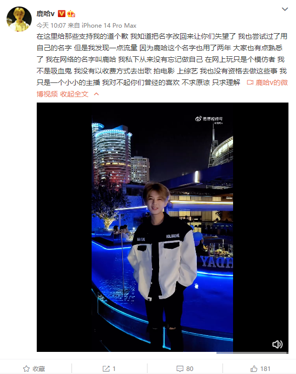 10月22日,因模仿超人气偶像巨星鹿晗走红的鹿哈,突然通过微博公开向鹿晗粉丝道歉,表示自己将名字改回来,肯定会让很多人感到特别的失望,但这也是没有办法的事,因为用自己的名字没有流量,所以为了生存不得已而为之。