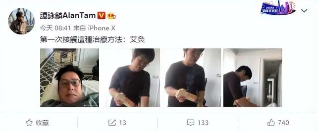 10月25日,知名男歌手谭咏麟通过微博晒出了自己接受艾灸治疗的照片,并配文表示这是他第一次接触这种治疗方法,觉得挺新鲜好奇的,但并没有透露治疗后的效果如何。而此前他因运动过度导致腿部受伤,让很多歌迷感到特别担心。