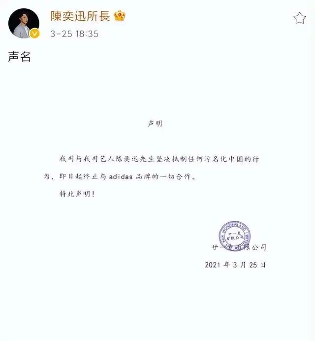 除了疫情以外,还有就是陈奕迅在香港那边受到了比较强烈的抵制,就是因为去年3月份新疆棉花事件爆发后,陈奕迅在第一时间果断与Adidas终止一切合作,宁可冒着巨额索赔的风险,也不愿意与之同流合污,获得了无数爱国人士的支持。