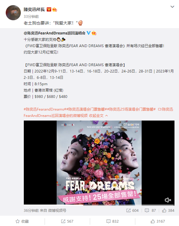 10月26日,实力派男歌手陈奕迅通过微博庆祝自己25场演唱会门票全部售罄,并且用非常老土的表白方式,给买票支持他的歌迷们说了一句:“我爱大家!”再次在全网引起了非常大的关注和热议。