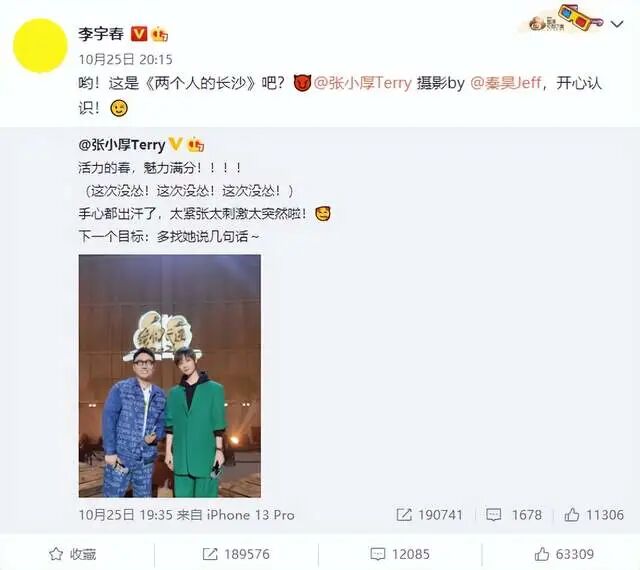 日前,知名女歌手李宇春受邀来到长沙录制新节目,而过去很少晒工作照的她,突然在微博上转评了与张小厚的合影照,表示能够跟对方认识感到很开心。同时李宇春的现身露面,有力回击了网上疯传关于她病重坐轮椅出行一事。