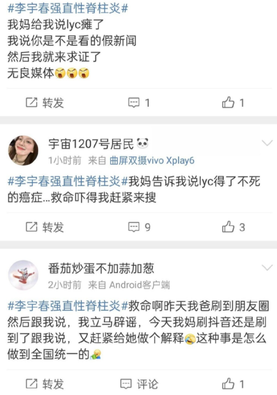 除了歌迷以外,很多网民也都收到过类似的消息,说李宇春患病的事都是从父母那里得知的。由此不难看出,这已经不仅仅只是娱乐八卦新闻了,甚至早已蔓延到养生健康领域,以虚假耸人听闻的标题和内容,骗取大家的关注和流量。
