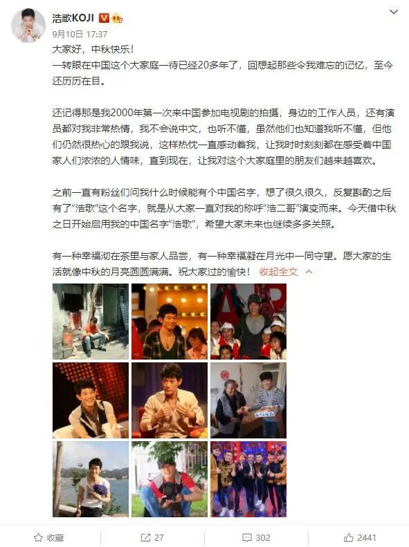 而在今年九月份的时候,也就是中秋节当天,矢野浩二突然通过微博宣布,将会启用中国名字“浩歌”,希望大家能够继续支持和关照他,而他也将会努力拍戏,给观众们带来更多优秀的作品。