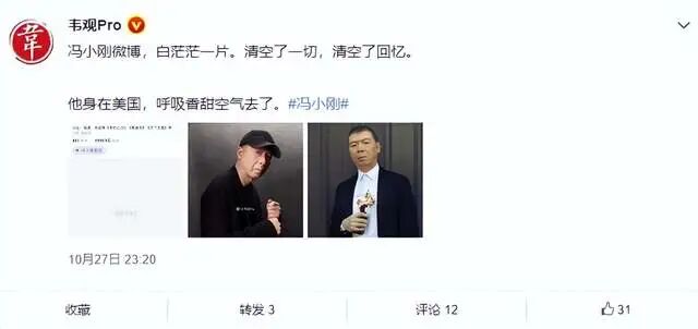 于是就引来了不少大V的冷嘲热讽,比如知名作家韦观在微博上调侃道:“冯小刚微博,白茫茫一片。清空了一切,清空了回忆。他身在美国,呼吸香甜空气去了。”