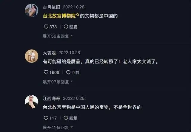 可要是站在民族角度,或者说是站在爱国角度,他说的那句话就有些过于见外了。可如果换个词说台北故宫的文物是属于中国的宝,那就是完全不同的概念了,至少对于大多数国人而言,这话是没有任何毛病的。