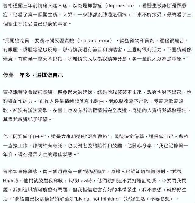 其实,曹格确实生病了,多年前就患上了抑郁症,但凡熟知他的人,尤其是歌迷都知道他的这个病情,吃药都吃了好长一段时间了,但治疗效果并不是很理想。
