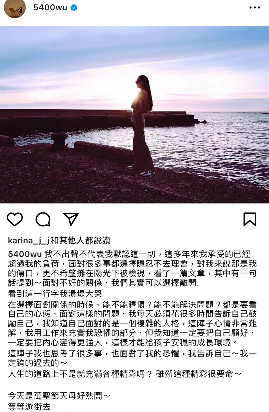 而就在曹格频繁发文的前一天,吴速玲突然更新了社交账号,晒出了自己在海边度假的唯美照片,但却写下了满是伤感的文字,开头便强调自己不出声并不代表默认这一切,还说这么多年承受了超负荷的压力,只是选择隐忍不去理会,但实质性伤害却已经造成。