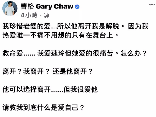 紧接着没过多久的时间,曹格又继续在社交平台上发文,说自己很珍惜老婆吴速玲的爱,所以觉得对方离开他算是一种解脱,但最大的矛盾在于,他真的很爱很爱吴速玲,并且用了“救命”和“痛苦”来形容自己此刻爱而不得的心情。