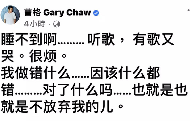 最夸张的就是,曹格表示睡不着觉,就算是听歌也会哭,感到特别的烦躁,不知道自己做错了什么,强调不想放弃自己的儿子。