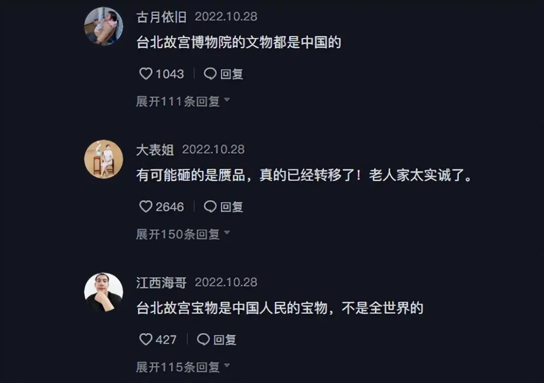 对此,有不少网民看到他发的这条视频后,纷纷在第一时间留言进行纠正,说台北故宫的文物是中国人民的宝物,而不是全世界的宝物。