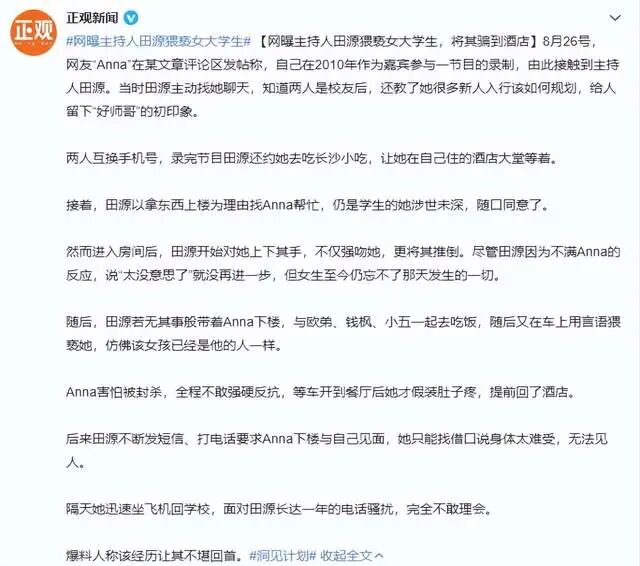 直到去年八月份的时候,一位名叫“Anna”女网友自曝曾经被田源猥亵过,当时是因为自己年轻不懂事,同样作为嘉宾害怕被封杀,所以就没有将这件事给揭露出来。