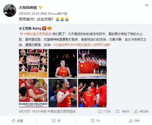 他最近的一条微博动态也将永远停留在9月30日,那就是给中国女篮王思雨加油打call,满满的正能量。