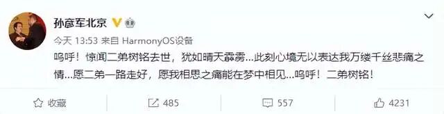 当听闻陆树铭病逝之后,刘备扮演者孙彦军似乎有些入戏太深,在微博上发文悼念,直呼陆树铭为二弟,对于陆树铭突然去世感到非常惊讶,犹如晴天霹雳,除了被悲痛以外,只求能够在梦中相见。