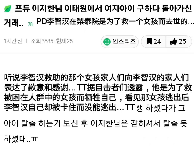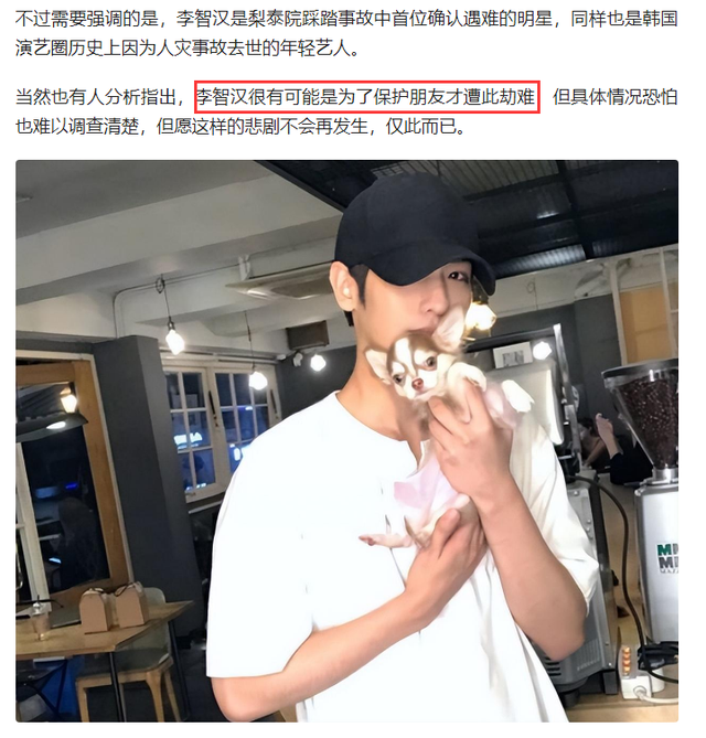如此说来的话,李智汉在踩踏事故中遇难的性质就完全不同了,如果纯粹只是意外导致死亡,顶多也只是哀悼一下而已。但现在问题在于他是见义勇为牺牲掉的,这无疑是英雄的行为,而不仅仅只是明星身份了。