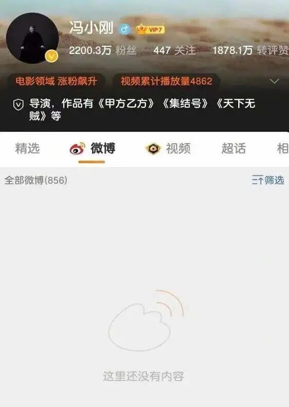 紧接着没过多久的时间,有人意外发现冯小刚的微博出了状况,已经看不到他发布的任何内容,于是又开始过度解读说是他清空了微博,甚至有人还脑洞大开,唯恐天下不乱,说这是官方的动作。