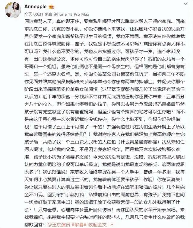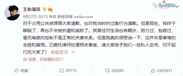 家暴视频被曝光出来后,王东并没有回避也没有否认,在微博上发文承认确实动手打了妻子,为自己过激行为感到抱歉。但让人无法理解的就是,王东却觉得家暴妻子是一种解脱,还说这并不是全貌和真相,表示将会委托律师处理好此事。