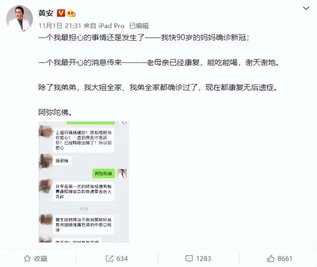 日前,知名男歌手黄安在微博上自曝称,90岁高龄的妈妈不幸确诊新冠,然而不幸中的万幸就是人没事,现在已经康复没有后遗症,能吃能喝,身体很好,让他感到既担心又欣慰。同时他还透露称,除了他弟弟以外,家人基本上都确诊过了。
