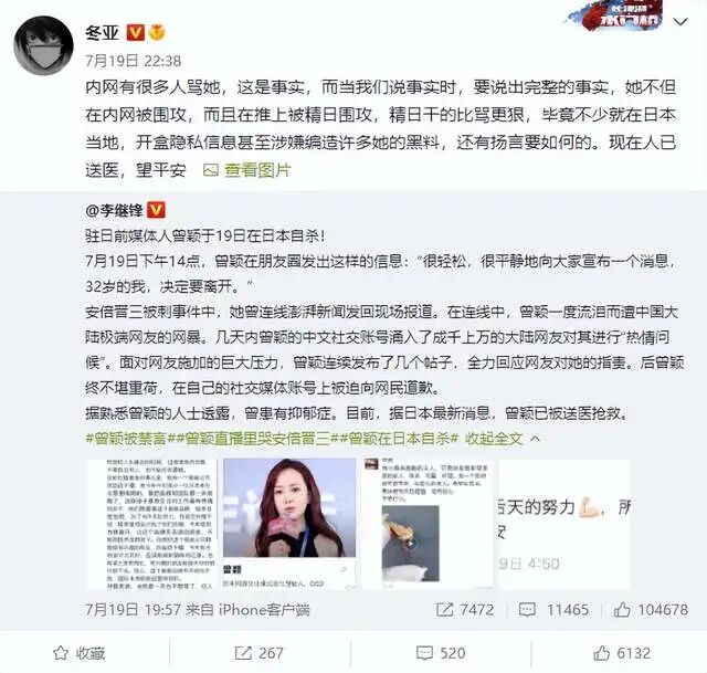 可更出人意料的是,大V冬亚曝光了曾颖自杀的动机,称其除了遭到国内网民攻击以外,在海外也遭到了大量精日分子的围攻,而且骂得还要更狠一些。