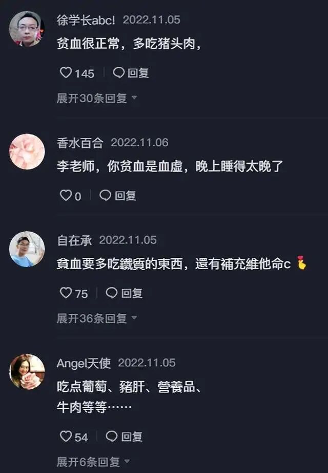 对此,很多影迷看到后纷纷留言给出了建议,有人说多吃点猪头肉,尤其是含铁质高的食物,同时也要补充维他命C;也有人说是熬夜睡太晚导致的血虚,要格外引起重视,养成良好的作息习惯。